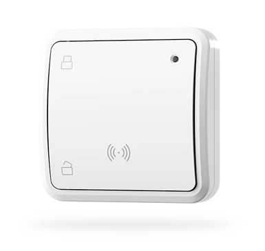 Vezeték nélküli fali kártyaolvasó (MIFARE, 13.56MHz) nyomógomb, kisebb rendszerekhez, vagy egy partíció vezérlésére, mint pl. egy iroda, raktár vagy garázs élesítésére vagy hatástalanítására. Kezelő helyett is használható, ha csak élesítés/hatástalanítás a feladat, mivel az applikációban mindent lát a Felhasználó. Használata rendkívül egyszerű és gyors. Helyezze elé a kártyát és nyomja meg a gombot. Szabotázsvédelmi áramkört tartalmaz és felügyeli a működését biztosító elem állapotát. A vezeték nélküli nyomógomb használatához a rendszerben telepített legalább egy darab JA-111R vagy JA-112R rádiós vevőmodul modul szükséges, a központban egy memóriahelyet foglal. Tápellátását 3 db LR03 (AAA) 1.5 V / 1.2 Ah elem, biztosítja (nem tartozék).